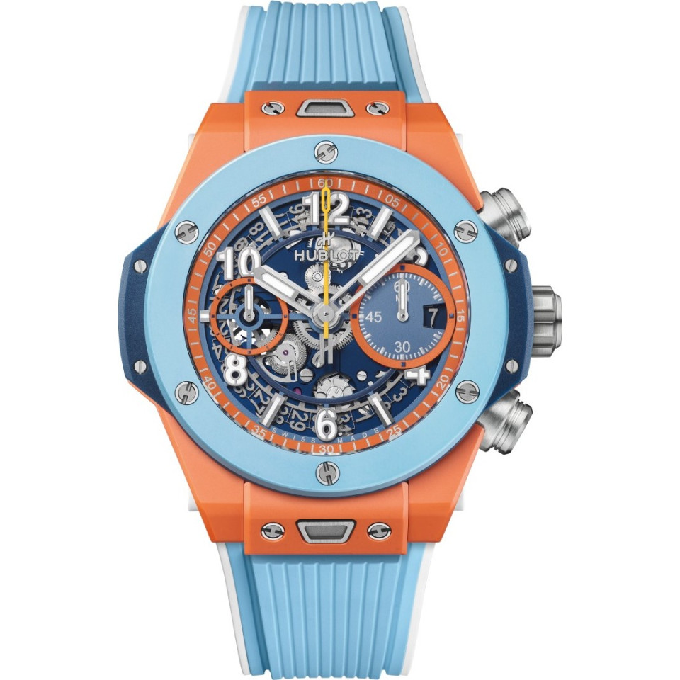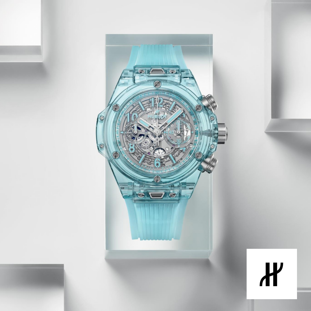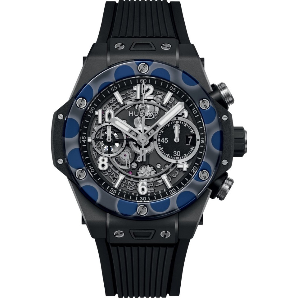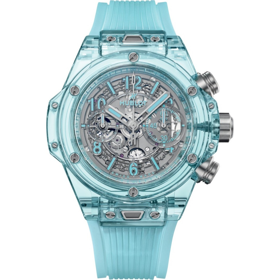 Bằng cách phát triển bộ máy chronograph tự động của riêng mình, Hublot muốn nó – giống như tất cả các sáng tạo của mình – là đầu tiên, khác biệt và độc đáo. Là linh hồn của đồng hồ, bộ máy này với "trái tim mở" cho thấy thiết kế được tái tạo hoàn toàn, với hệ thống ly hợp kép và bánh xe cột từ phía mặt số cũng như dự trữ năng lượng 72 giờ. Cấu trúc 354 thành phần của nó đã được đơn giản hóa hết mức có thể để cải thiện độ tin cậy và độ bền. Sapphire: Trong quá trình tìm kiếm sự kết hợp hoàn hảo giữa bộ máy và vỏ, các kỹ sư và nhà hóa học của Hublot đã nghiên cứu và phát triển một vật liệu trong suốt để lộ trái tim của đồng hồ, đồng thời đủ mạnh mẽ để bảo vệ hiệu quả cơ chế. Đó là cách Nhà sản xuất đã trở thành chuyên gia về sapphire tổng hợp, một vật liệu mà từ đó nó có được những phẩm chất thẩm mỹ độc đáo trong ngành chế tạo đồng hồ – biến mỗi chiếc đồng hồ thành một tác phẩm nghệ thuật. Kích thước 44 mm. Vỏ bằng tinh thể Sapphire xanh nước biển đánh bóng. Vành bằng tinh thể Sapphire xanh nước biển đánh bóng. Khả năng chống nước 50m hoặc 5 ATM. Mặt kính Sapphire có lớp phủ chống phản quang. Mặt số bằng khung xương trong suốt đánh bóng. HUB1280 UNICO Manufacture Chronograph Flyback. Bộ máy có bánh xe cột. Dự trữ năng lượng khoảng 72 giờ. Dây đeo bằng cao su lót màu xanh nước biển trong suốt. Khóa cài bằng titan.