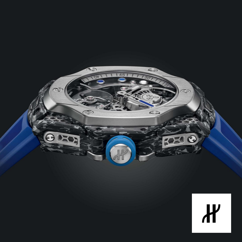 Trong suốt 44 năm, Hublot không ngừng đổi mới, vượt qua mọi giới hạn về kỹ thuật và thẩm mỹ của các mẫu đồng hồ. Sự cân bằng tinh tế giữa chuyên môn chế tác đồng hồ và tầm nhìn về tương lai, đồng hồ Hublot mang đậm phong cách đương đại. Thành công này có được là nhờ những nghiên cứu tiên tiến về vật liệu và sự hợp tác với một số nghệ sĩ và nhà thiết kế hàng đầu thế giới. Samuel Ross đã kết hợp một cách ngoạn mục hai khía cạnh này. Nghệ sĩ và Nhà thiết kế Samuel Ross đã định hình quan điểm của mình thông qua nghệ thuật, thông qua việc phát triển kiến trúc cho cơ thể. Thông qua việc thành lập cả hai công ty A-Cold-Wall***, từ năm 2015, và SR_A từ năm 2019, Ross đã tiên phong trong một ngôn ngữ thiết kế đặc trưng đã được chuyển thành những sự hợp tác sâu sắc, cấp tiến, phát triển và thiết lập một lượng khán giả sùng bái toàn cầu được kính trọng. Điều này đã đạt được bằng cách phát triển một quan điểm mới của thế hệ thiên niên kỷ về hàng xa xỉ, nghệ thuật và thời trang thông qua xưởng chế tác SR_A tại Châu Âu của ông – đồng sáng lập cùng năm ông được trao Giải thưởng Thiết kế Hublot. Kích thước 44 mm. Vỏ bằng Titan siêu mịn sáng bóng và Carbon xám mờ. Vành Titanium siêu mịn sáng bóng và được xử lý satin. Khả năng chống nước 30m hoặc 3 ATM. Mặt kính Sapphire chống phản quang. Mặt kính Sapphire với vạch chỉ giờ 4h và 7h màu xanh đậm. Mặt số SuperLuminova 9h màu xanh nhạt. Bộ máy HUB6035 Manufacture Automatic Tourbillon. Dự trữ năng lượng 72 giờ. Dây đeo: Dây đeo đầu tiên: Cao su trơn màu xanh đậm. Dây đeo bổ sung: Cao su trơn màu đen. Khóa cài: Khóa cài Deployant bằng Titan