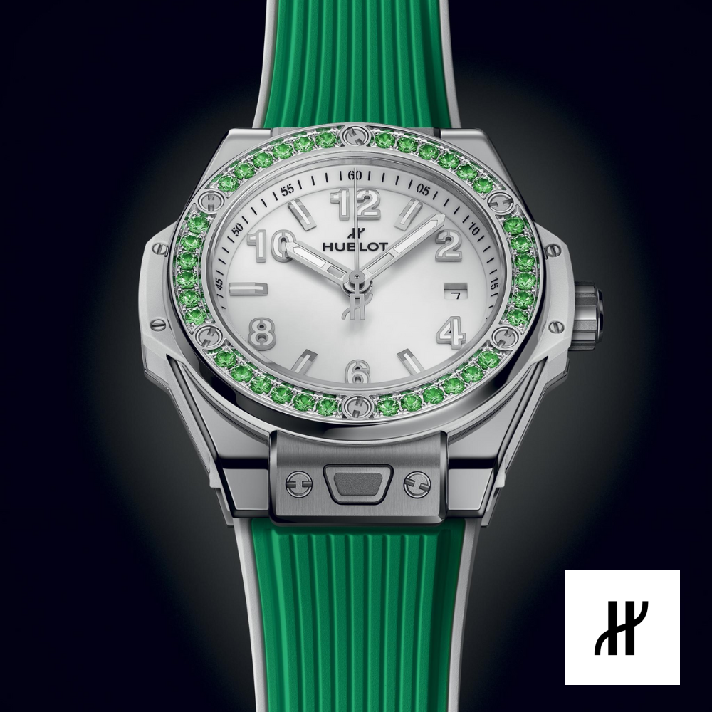 Nghệ thuật Hợp nhất được thể hiện xuyên suốt bộ máy. Với những chiếc đồng hồ đơn giản nhưng sở hữu những khái niệm chế tác đồng hồ đột phá, Hublot đã tạo ra một loạt bộ máy “in-house” độc đáo. Thiết kế độc đáo của đồng hồ bấm giờ tự động Unico. Dự trữ năng lượng vô song của các bộ máy Meca-10, Tourbillon và MP-11. Phương pháp tiếp cận động cơ mang tính cách mạng với 11 barrel MP-05 và dự trữ năng lượng 50 ngày. Trong “Nghệ thuật Hợp nhất”, Hublot thực hiện sự kết hợp hoàn hảo giữa chức năng, kiến trúc và thiết kế. Hublot chỉ sử dụng thép 316L cấp y tế, không oxy hóa, kết hợp sắt làm kim loại nền, crom chống ăn mòn và niken để có độ bền cơ học tối ưu. Hợp kim ổn định và bền bỉ này hoàn toàn chịu được mọi nguy hiểm trong cuộc sống hàng ngày. Về mặt thẩm mỹ, nó dễ dàng được “trang trí”; dù là thông qua đánh bóng hay hoàn thiện satin, nó cho phép tạo ra những lớp hoàn thiện xen kẽ tinh tế. Kích thước 33 mm. Vỏ thép không gỉ đánh bóng và hoàn thiện bằng satin. Vành thép không gỉ đánh bóng được đính 36 viên đá Tsavorite. Khả năng chống nước 100m hoặc 10 ATM. Mặt kính Sapphire chống phản quang. Mặt số trắng bóng. Bộ máy tự động lên dây cót HUB1120. Dự trữ năng lượng 40 giờ. Dây đeo: Dây cao su lót màu trắng và xanh táo. Dây đeo bổ sung: Xanh táo. Khóa cài: Khóa cài bằng thép không gỉ