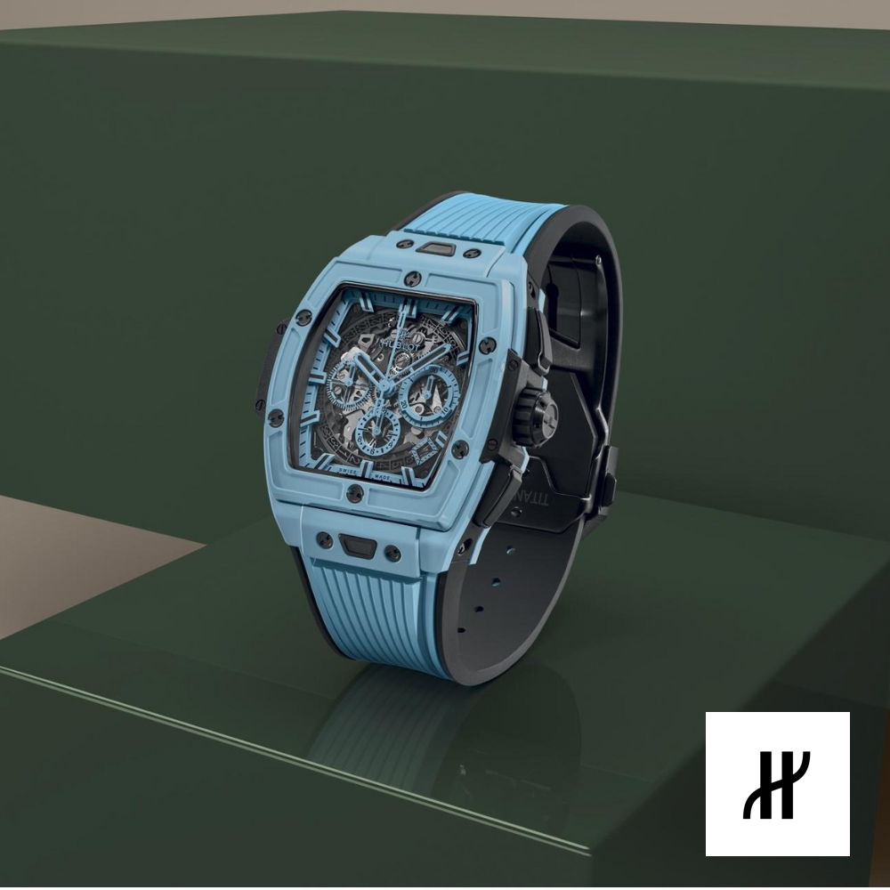 Caliber HUB4700 là phiên bản kế thừa của Caliber El Primero nổi tiếng – chiếc đồng hồ bấm giờ đầu tiên có chức năng lên dây tự động tích hợp (năm 1969), đồng thời cũng là chiếc đồng hồ bấm giờ cơ học đầu tiên được trang bị tần số 5 Hz (36’000 alt/h) cho phép độ chính xác 1/10 giây. Trong sự kết hợp hoàn hảo giữa truyền thống và đổi mới, bộ máy hoàn toàn lộ cơ này hiện được trang bị bộ phận điều chỉnh silicon đảm bảo hiệu suất tiên phong, độ chính xác và độ tin cậy. Đối với Hublot, vật liệu là một phần không thể thiếu trong thiết kế đồng hồ của họ. Chúng phải bổ sung cho thiết kế của họ, đồng thời bảo vệ cơ chế của chúng và chịu được thử thách của thời gian. Do đó, Nhà sản xuất đã chọn sử dụng gốm công nghệ cao cho một số vành bezel và vỏ đồng hồ; đây là vật liệu siêu bền và gần như hoàn toàn chống trầy xước (ngoại trừ kim cương) với lớp nền zirconium được thiêu kết ở nhiệt độ rất cao. Kích thước 42 mm. Vỏ gốm màu xanh da trời được phun cát và đánh bóng. Vành gốm màu xanh da trời được phun cát và đánh bóng. Khả năng chống nước 100m hoặc 10 ATM. Mặt kính Sapphire có lớp phủ chống phản quang. Mặt kính Sapphire. Bộ máy HUB4700 Bộ máy bấm giờ Skeleton tự lên dây cót. Dự trữ năng lượng 50 giờ. Dây đeo Cao su có cấu trúc lót màu đen và xanh nhạt. Khóa Gốm đen và Khóa cài bằng Titan mạ đen