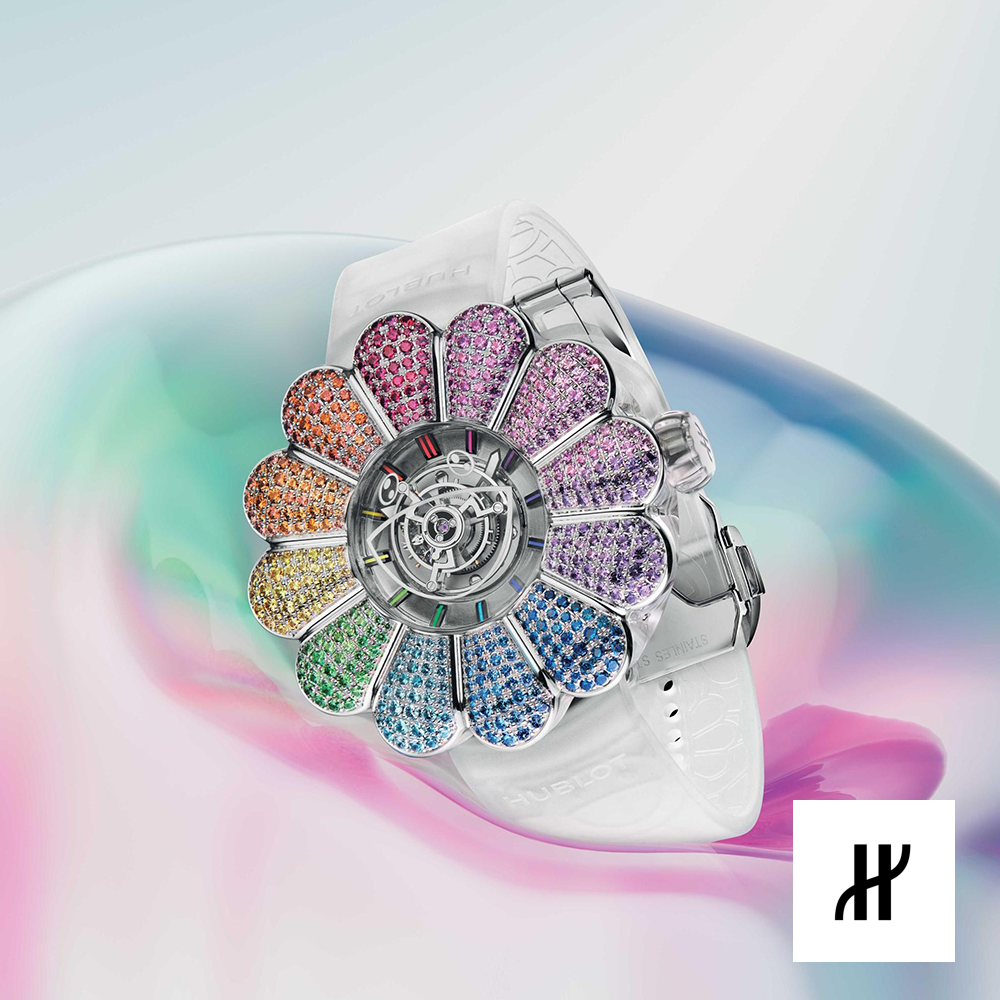 Vượt qua những quan niệm cố hữu về nghệ thuật đương đại, Takashi Murakami đã tạo ra phong trào nghệ thuật của riêng mình có tên là "Superflat", mở rộng từ mỹ thuật như hội họa, điêu khắc và sắp đặt đến phương tiện truyền thông thương mại hơn như thời trang và hoạt hình. Làm mờ ranh giới giữa nghệ thuật cao cấp và thấp cấp, Murakami kết hợp tính thẩm mỹ của truyền thống nghệ thuật Nhật Bản với nghệ thuật và văn hóa đương đại. Trong tất cả các tác phẩm của ông, tác phẩm mang tính biểu tượng nhất là bông hoa cười, mà HUBLOT đã tìm cách đưa vào bối cảnh chế tác đồng hồ thông qua một số tác phẩm hợp tác