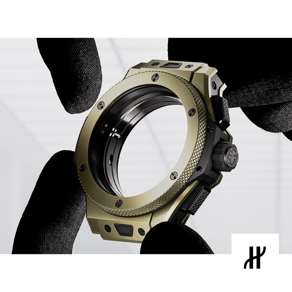 Bằng cách phát triển bộ máy chronograph tự động của riêng mình, Hublot muốn nó – giống như tất cả các sáng tạo của mình – là đầu tiên, khác biệt và độc đáo. Là linh hồn của đồng hồ, bộ máy với "trái tim mở" này cho thấy thiết kế được tái tạo hoàn toàn, với hệ thống ly hợp kép và bánh xe cột từ mặt số cũng như khả năng dự trữ năng lượng 72 giờ. Cấu trúc 354 thành phần của nó đã được đơn giản hóa hết mức có thể để cải thiện độ tin cậy và độ bền. Vàng chống trầy xước chưa từng tồn tại trước đây, vì vậy Hublot đã phát minh ra nó. Được phát triển và cấp bằng sáng chế bởi Nhà sản xuất, Magic Gold là hợp kim vàng 18K đầu tiên và duy nhất trên thế giới có khả năng chống trầy xước hoàn hảo, ngay cả với lối sống cực kỳ năng động. Nó vẫn giữ được vẻ đẹp, độ sáng bóng và vẻ ngoài bóng bẩy theo thời gian. Một cuộc cách mạng thực sự trong thế giới vật liệu quý. Kích thước 43 mm. Vỏ vàng ma thuật đánh bóng. Vành vàng ma thuật đánh bóng với họa tiết có cấu trúc ở cạnh bên. Khả năng chống nước 100m hoặc 10 ATM. Mặt kính Sapphire chống phản quang. Mặt số được dập «Hiệu ứng Carbon» hoàn thiện bằng satin. Đồng hồ bấm giờ tự động lên dây cót HUB1280 UNICO Manufacture Flyback. Bộ máy có bánh xe cột. Dự trữ năng lượng khoảng 72 giờ. Dây đeo: Dây đeo cao su có cấu trúc màu đen. Khóa: Gốm đen và Titan mạ đen