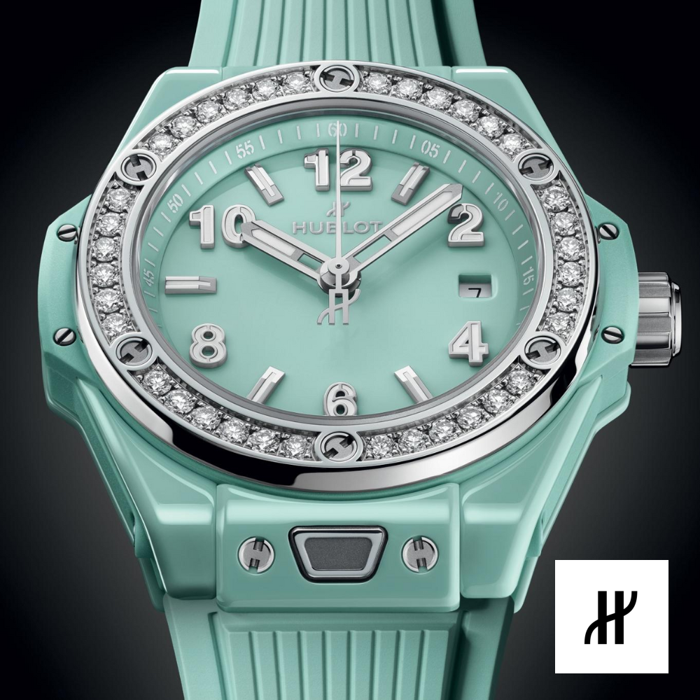 Nghệ thuật kết hợp được thể hiện xuyên suốt đến tận trái tim của bộ máy. Với những chiếc đồng hồ đơn giản cùng các khái niệm chế tác đồng hồ sáng tạo, Hublot đã tạo ra một loạt các bộ máy "nội bộ" độc đáo. Một thiết kế độc đáo của đồng hồ bấm giờ tự động Unico. Dự trữ năng lượng vô song của các cỡ nòng Meca-10, Tourbillon và MP-11. Một phương pháp tiếp cận động cơ mang tính cách mạng với 11 thùng cót MP-05 và dự trữ năng lượng 50 ngày. Trong "Nghệ thuật kết hợp", Hublot thực hiện sự kết hợp hoàn hảo giữa chức năng, kiến trúc và thiết kế. Gốm Đối với Hublot, vật liệu là một phần không thể thiếu trong thiết kế đồng hồ của họ. Chúng phải bổ sung cho thiết kế của họ, đồng thời bảo vệ cơ chế của họ và chịu được thử thách của thời gian. Do đó, Nhà sản xuất đã chọn sử dụng gốm công nghệ cao cho một số vành và vỏ; đây là vật liệu siêu bền và gần như hoàn toàn chống trầy xước (ngoại trừ kim cương) với lớp nền là zirconium được thiêu kết ở nhiệt độ rất cao. Kích thước 33 mm. Vỏ màu xanh bạc hà đánh bóng. Vành thép không gỉ đánh bóng đính 36 viên kim cương 0,76 carat. Khả năng chống nước 100m hoặc 10 ATM. Mặt kính Sapphire chống phản quang. Mặt số màu xanh bạc hà sáng bóng. Bộ máy tự lên dây cót HUB1120. Dự trữ năng lượng 40 giờ. Dây đeo bằng cao su lót màu xanh bạc hà. Khóa cài bằng thép không gỉ
