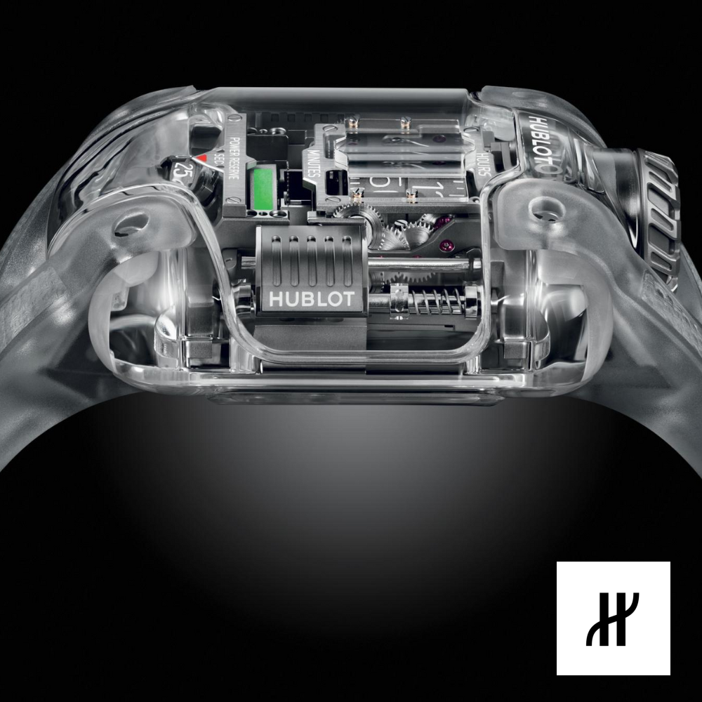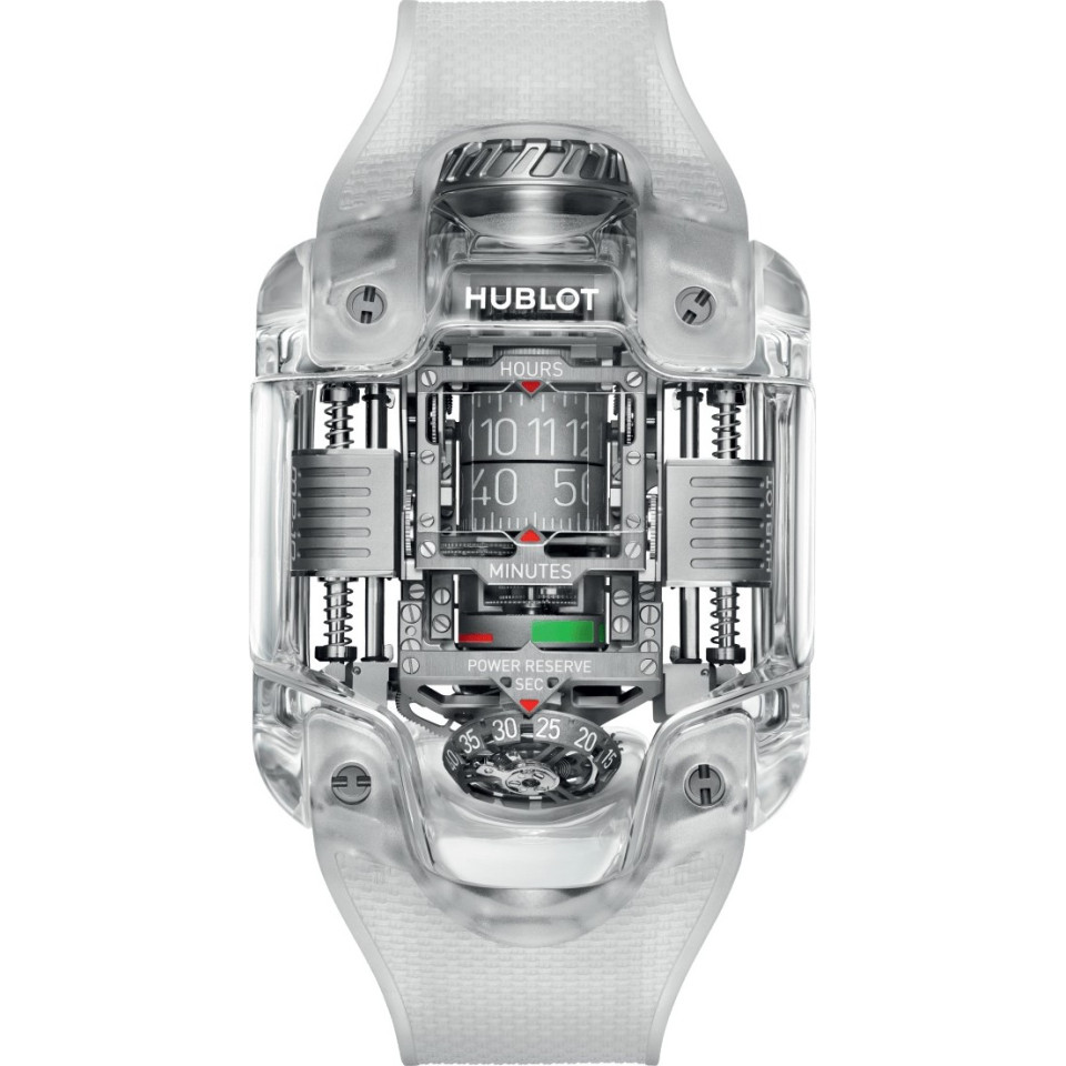 Theo bản năng, chúng tôi muốn mô tả chiếc đồng hồ theo cách truyền thống… Trước tiên là những con số ấn tượng: 592 chi tiết, 5 năm nghiên cứu và phát triển, 2 quả lắc tuyến tính, 1 tourbillon nghiêng, dự trữ năng lượng hình tròn, một mẫu đồng hồ được sản xuất giới hạn chỉ 30 chiếc. Tiếp theo là các chỉ báo. Ở đây, mọi thứ trở nên phức tạp hơn một chút: MP-10 không có kim. Thay vào đó là bốn màn hình hiển thị xoay liên tục: giờ và phút ở phần ba trên cùng của mặt số, kết hợp với một kính lúp vô hình; dự trữ năng lượng hình tròn ở phần ba trung tâm, với vùng xanh lá cây và vùng đỏ rất rõ ràng; và giây ở phần ba dưới cùng được hiển thị trực tiếp trên lồng tourbillon. Nó được làm từ nhôm nguyên khối, treo và nghiêng, và đơn xin cấp bằng sáng chế cho cấu trúc cơ học độc đáo này đang chờ xử lý. Chiếc đồng hồ không có mặt số: Hublot đã hợp nhất bộ máy với mặt số. Bộ máy là bộ mặt và linh hồn của chiếc đồng hồ. Ánh mắt được hướng thẳng đến cơ chế để đọc thời gian. MP-10 sở hữu thiết kế kiến trúc tinh tế và bộ máy đặc biệt biểu cảm, được xây dựng xung quanh khối lượng và chiều sâu. Tuy nhiên, điều này hoàn toàn không ảnh hưởng đến việc đọc giờ. Thay vào đó, nó làm cho việc đọc giờ trở nên đơn giản hơn. Giờ được đọc từ trên xuống dưới, mượt mà và tự nhiên. Dự trữ năng lượng đặc biệt ấn tượng, với đĩa hai tông màu (đỏ và xanh lá cây) được đặt đồng trục với giờ và phút. Kích thước 54,1 x 41,5 mm. Vỏ kính Sapphire đánh bóng. Khả năng chống nước 30m hoặc 3 ATM. Mặt kính Sapphire chống phản quang. Mặt số: Giờ, phút, dự trữ năng lượng: Hiển thị bằng trụ nhôm màu xám anodized. Giây: Hiển thị bằng nhôm màu xám anodized với lớp phát quang trắng gắn trên Tourbillon treo. Bộ máy: HUB9013. Bộ máy tự động lên dây cót dự trữ năng lượng và Tourbillon lộ cơ nghiêng 35°. Dự trữ năng lượng: Khoảng 48 giờ. Dây đeo: Cao su trong suốt. Khóa: Khóa cài bằng titan.